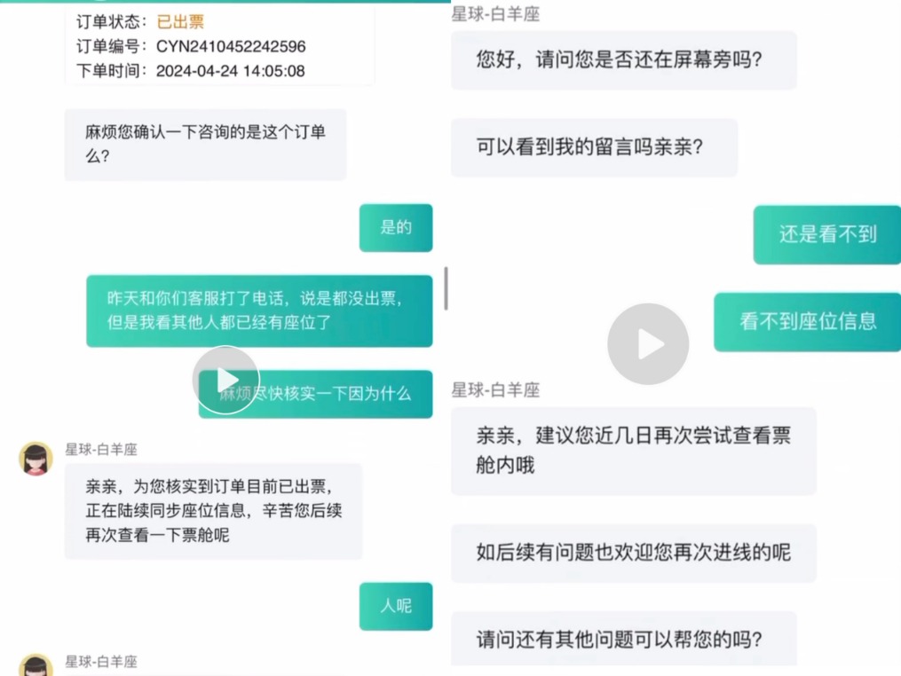 据王林讲述,他于4月24日在票星球购入了三张票价880元的徐佳莹北京站的演唱会门票。5月14日,因为配票后没显示座位,王林询问线上客服原因。当时得到的答复是“会有专员跟进”。再接到信息就是无法出票,被强制退票的消息。“也就是说我花了1000多参与了一次抢票而已?”