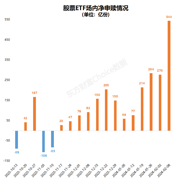 2023年10月23日(周一),中央汇金宣布增持ETF。从当日至今,A股ETF资金净流入已超过4000亿元,堪称“史诗级抄底”。从份额变化来看,A股市场股票ETF已连续13周净流入,春节前最后一周的净申购更是高达544亿份。